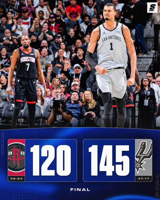 馬刺連續(xù)遠投不進,杜蘭特上籃得分,申京封蓋??怂?,福克斯命中三分球還以顏色。距離終場還剩4分13秒,火箭落后20分,烏度卡換下全部首發(fā),選擇提前棄子認負,比賽就此失去了懸念?;衾盏现羞h距離連續(xù)不進,哈珀上籃得手,杰夫格林2罰全中,馬刺換上板凳席末端的球隊,兩隊在場上練兵,時間逐漸走完。最終,馬刺以145比120完勝火箭,就此取得了3連勝。休斯頓排名從西部第3跌至第4,被森林狼反超。數(shù)據(jù)顯示,145分也創(chuàng)造了火箭本賽季的單場失分紀錄,此前僅為133分。