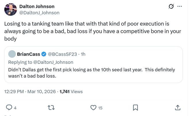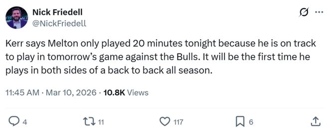 賽后ClutchPoints名記Brett Siegel坦言輸?shù)?、2場(chǎng)比賽對(duì)于勇士排名影響并不大,但輸給一支因擺爛被罰50萬(wàn)美元的魚腩無(wú)疑會(huì)打擊士氣。