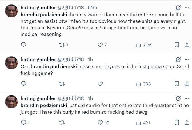 勇士球迷實在是忍無可忍的開噴了:波杰姆斯基這個家伙整個下半場就1次助攻簡直太離譜了,這家伙為了數(shù)據(jù)每一晚的套路實在是太明顯了令人想笑。完全不懂突破,只會在外面飄著投籃,我真XX的討厭這個卷發(fā)的混蛋。