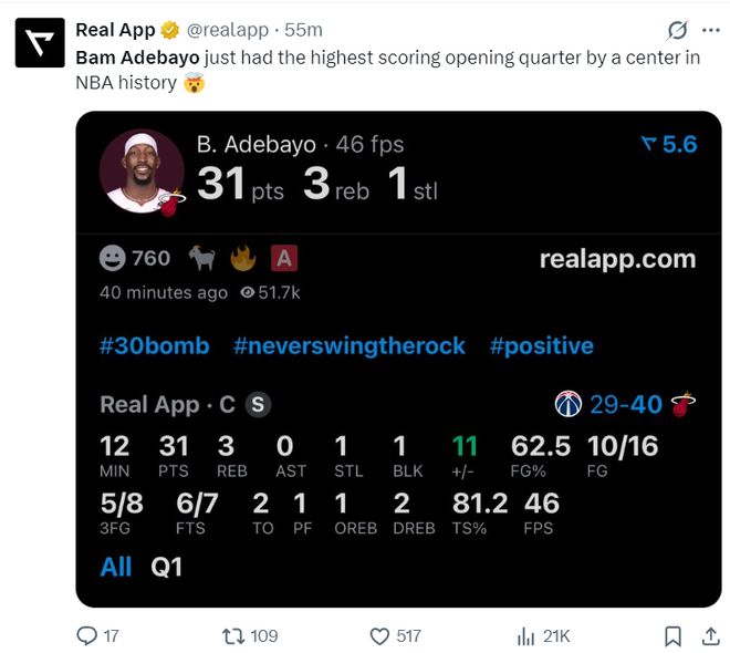 首節(jié)31分阿德巴約已經(jīng)創(chuàng)造多項(xiàng)紀(jì)錄:1.單節(jié)31分生涯新高;