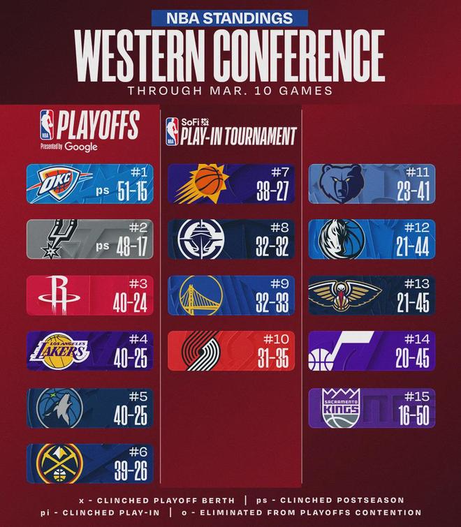 今天火箭113-99擊敗猛龍,火箭40勝24負(fù),從西部第4升至西部第3。掘金西部第6的位置也不穩(wěn),目前領(lǐng)先太陽(yáng)1個(gè)勝場(chǎng)。從西部第7到西部第3,只不過(guò)相差2.5個(gè)勝場(chǎng)。常規(guī)賽還有一個(gè)月,這5支球隊(duì)的排名可能到最后才能確定!
