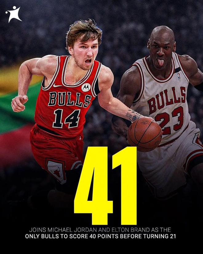 還有一個紀(jì)錄是:公牛隊史上一個在21歲前拿到40+的球員是布蘭德,再上一個?邁克爾喬丹。
