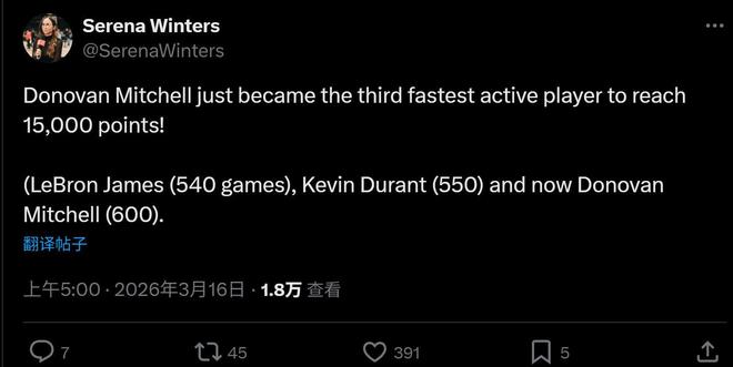 本場米切爾表現(xiàn)不錯,24中10拿下26分1板11助2搶斷,個人生涯總分突破15000分大關。